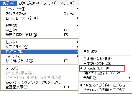 2.「1」を行なっても文字化けしている場合は、【表示】→【エンコード】→【Unicode(UTF-8)】を選択してください。