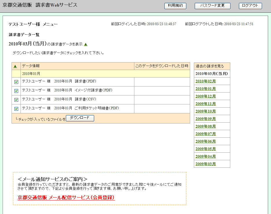 京都交通信販 メール配信サービスに会員登録を行っていただきますと、最新の請求書データのご用意ができました際に今後メールにてご通知させて頂きます。